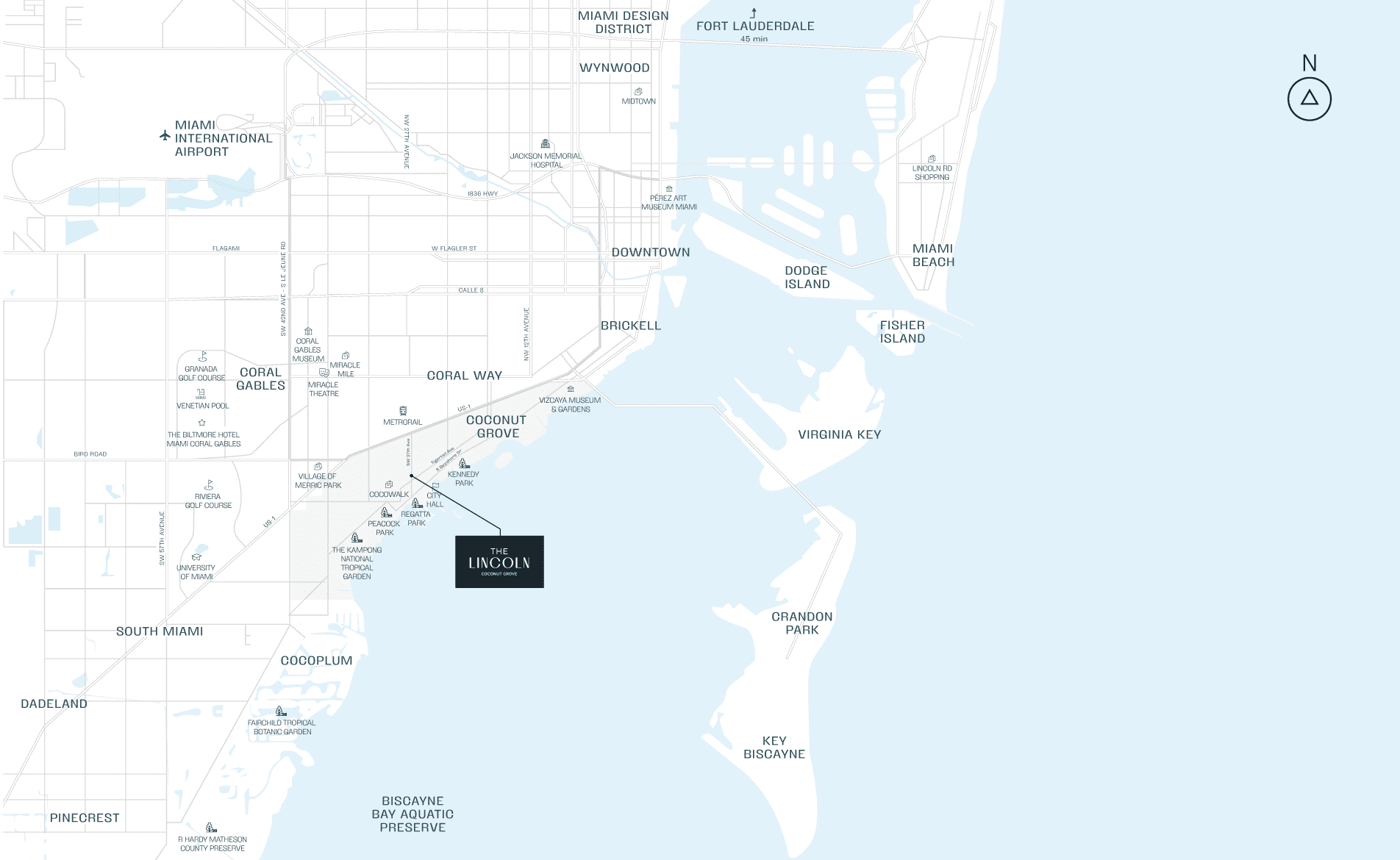 Beyond Coconut Grove, The Lincoln’s central location offers prime access to key destinations around the city. With Coral Gables, Brickell, Downtown Miami, and Miami Beach just minutes away, and Miami International Airport within a short drive, residents enjoy connectivity to the city’s best shopping, dining, business hubs, and travel routes.